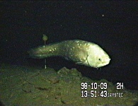 | ↑ソコボウズ | ↑左、隠れ蓑を背負ったカニの一種、ホモラ科の仲間 | ↑海底に半身を埋めたツバサシロウリガイと巻貝 | |||