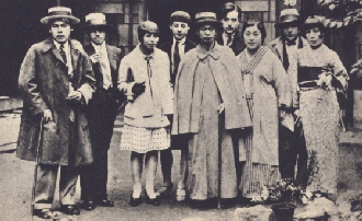 ヨーロッパに向かう少し前、桑三と田鶴子は川端康成らと伊香保温泉に旅行した。中央の康成を挟んで立つ後列のペアルックが彼ら。右端は宇野千代、田鶴子の左が三宅艶子その左が阿部金剛と、関係者が揃っている。